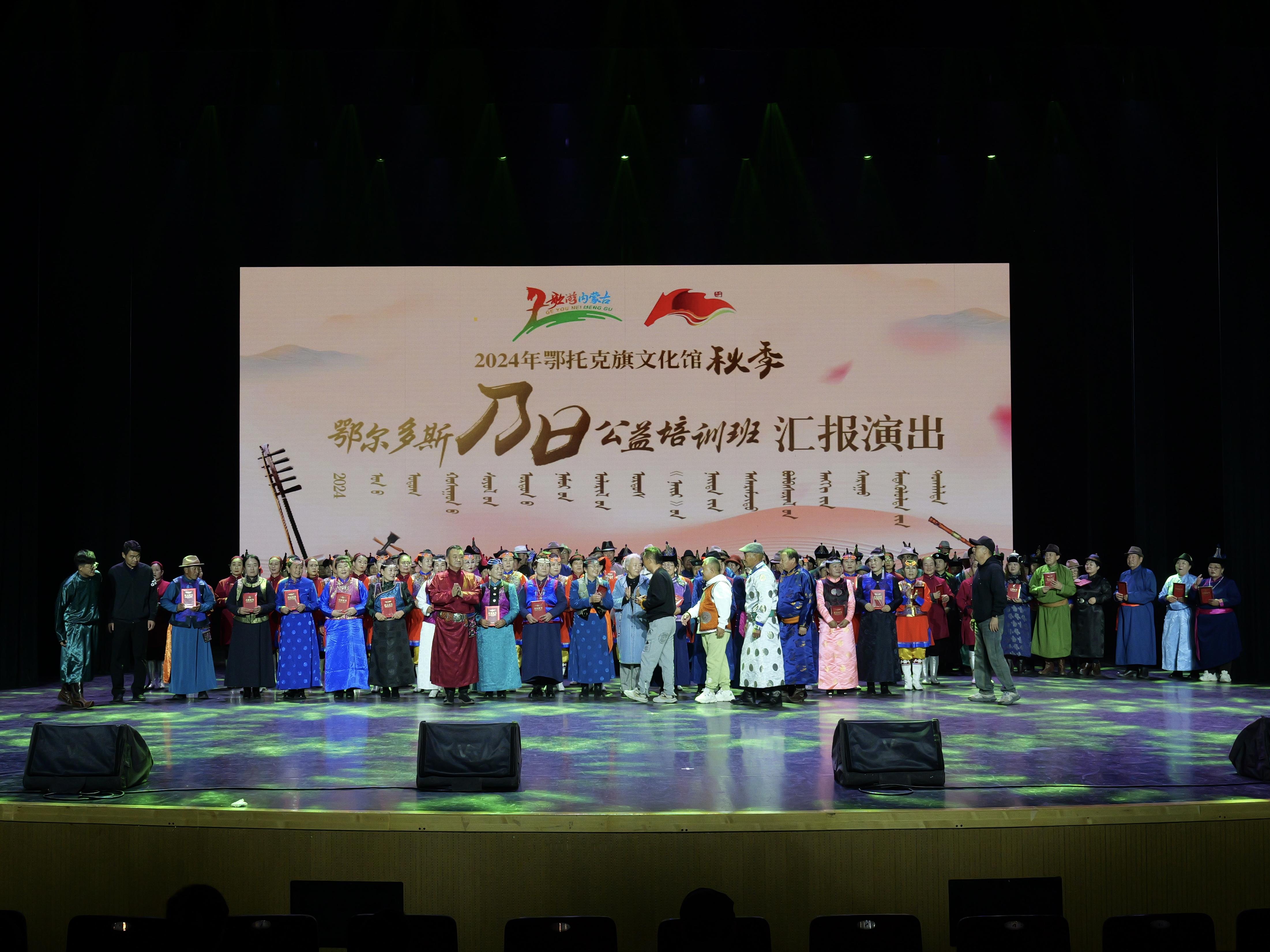 The Ordos Nair community training class performs on stage at the Otog Banner Cultural Center in Ordos, Inner Mongolia, Nov. 8, 2024. [Photo provided to China.org.cn]