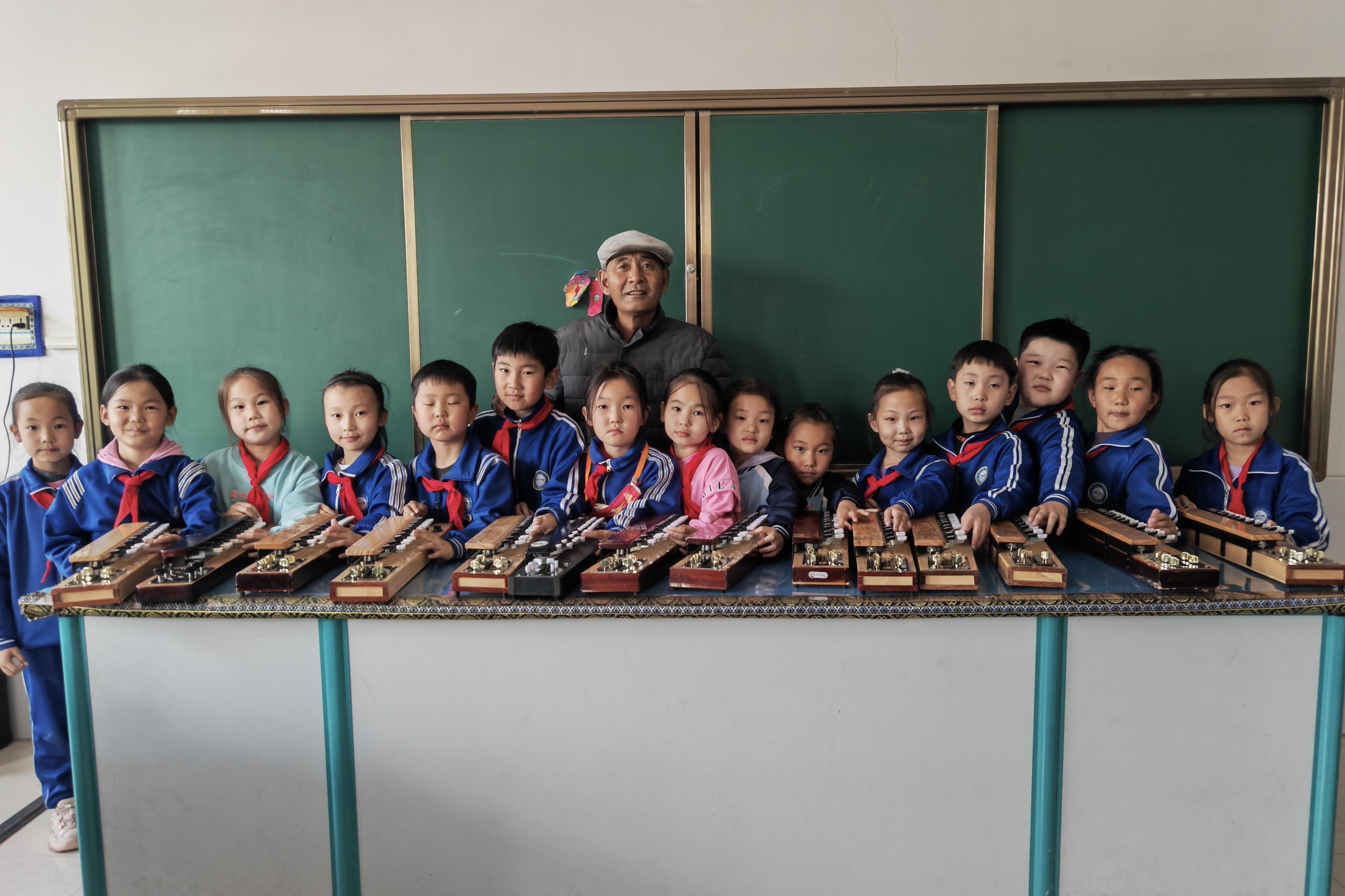 Manglaibatar poses for a photograph alongside schoolchildren learning the daqin. [Photo provided to China.org.cn]