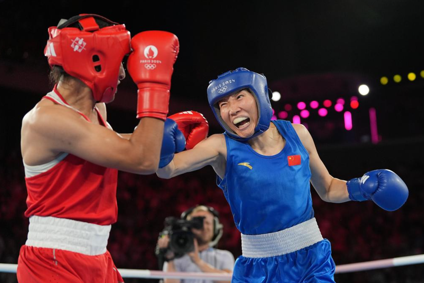 Yang Liu (in blue) of China competes against Imane Khelif of Algeria during the women's boxing 66kg final at the Paris 2024 Olympic Games in Paris, France, Aug. 9, 2024. (Xinhua/Jiang Wenyao)