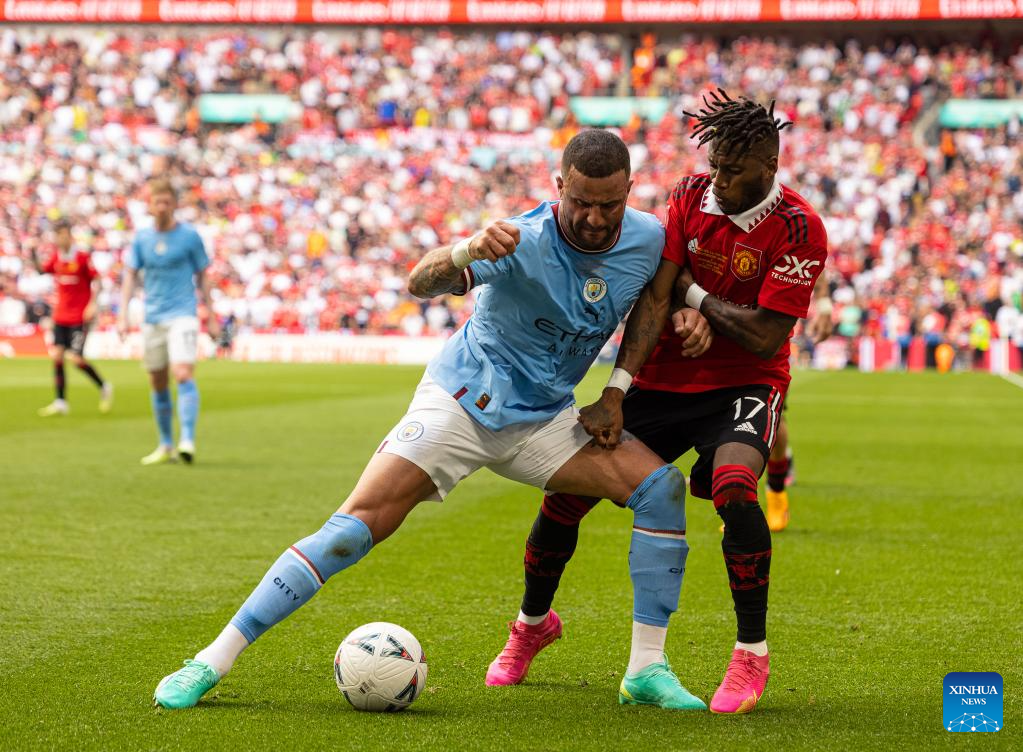 Manchester City's Kyle Walker (L) is challenged by Manchester United's Fred during the FA Cup Final match between Manchester City and Manchester United in London, Britain, on June. 3, 2023. Man City won 2-1. (Xinhua)
