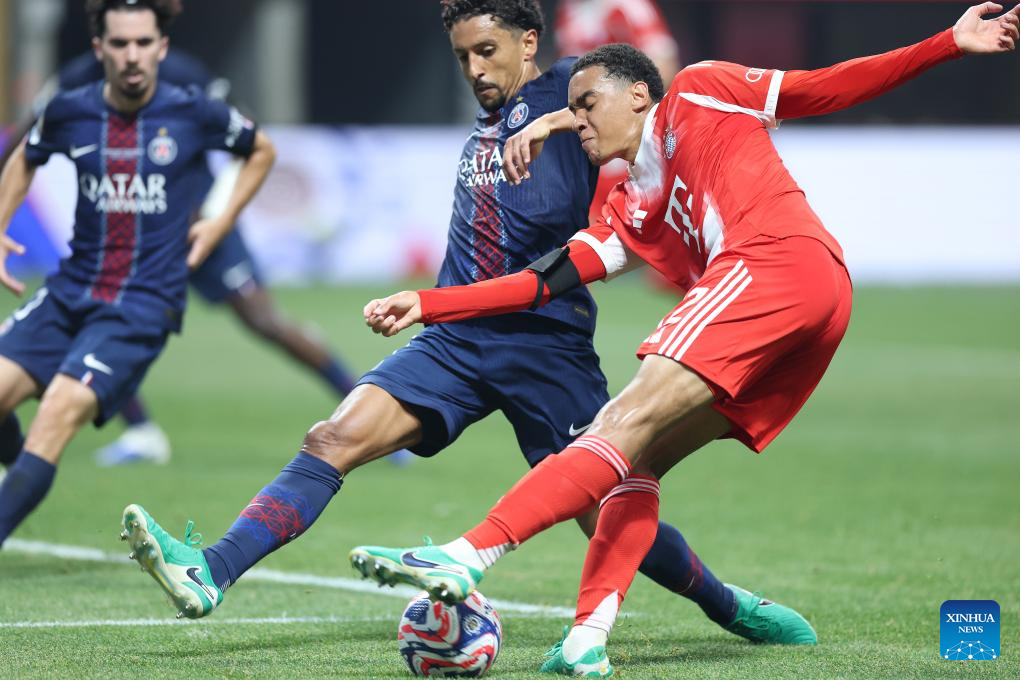Jamal Musiala (R) of FC Bayern Munich passes the ball during the quarterfinal match between Paris Saint-Germain (FRA) and FC Bayern Munich (GER) at the FIFA Club World Cup 2025 at the Mercedes-Benz Stadium, Atlanta, Georgia, the United States, July 5, 2025. (Xinhua/Li Ming)