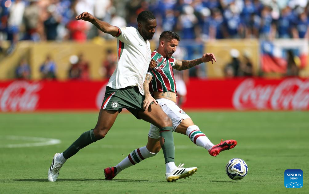 Everaldo (R) of Fluminense vies with Tosin Adarabioyo of Chelsea during the semifinal match between Fluminense FC (Brazil) and Chelsea FC (England) at the FIFA Club World Cup 2025 at the MetLife Stadium, New Jersey, the United States, July 8, 2025. (Xinhua/Li Ming)
