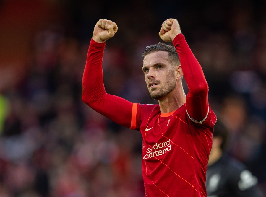 Liverpool's captain Jordan Henderson celebrates after the English Premier League match against Norwich City at Anfield in Liverpool, Britain, on Feb. 19, 2022. (Xinhua)