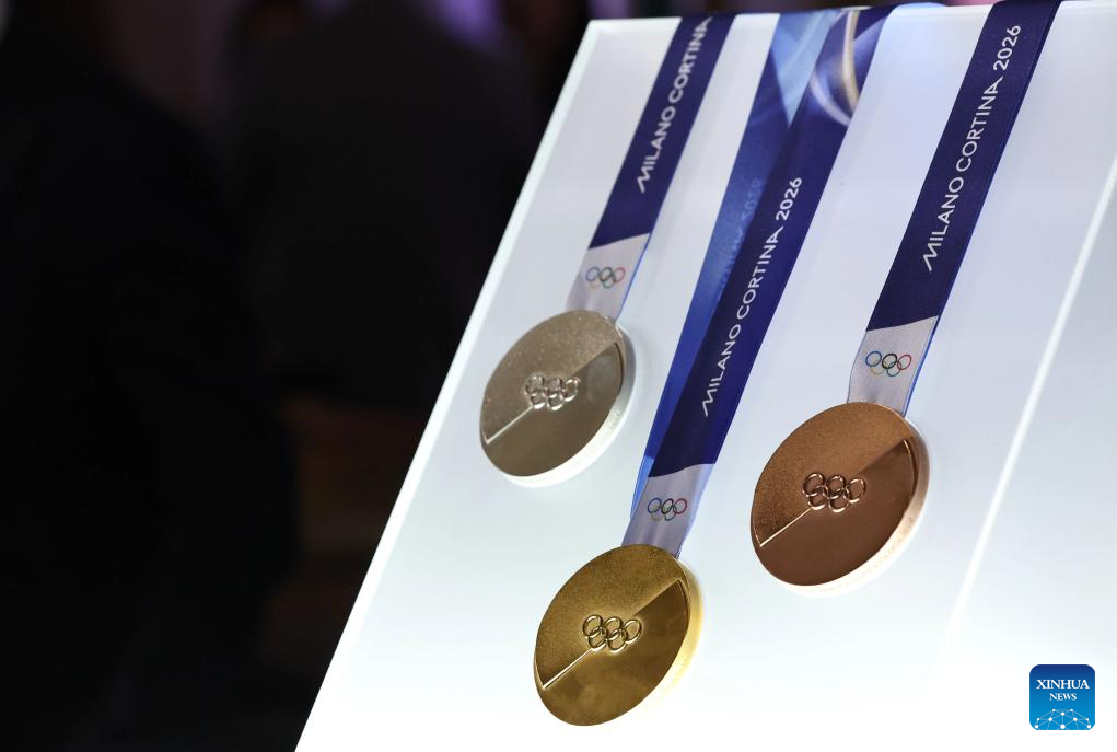 The medals for Milano Cortina 2026 Olympic Winter Games are displayed during the unveiling ceremony in Palazzo Balbi, Venice, Italy, on July 15, 2025. (Xinhua/Li Jing)
