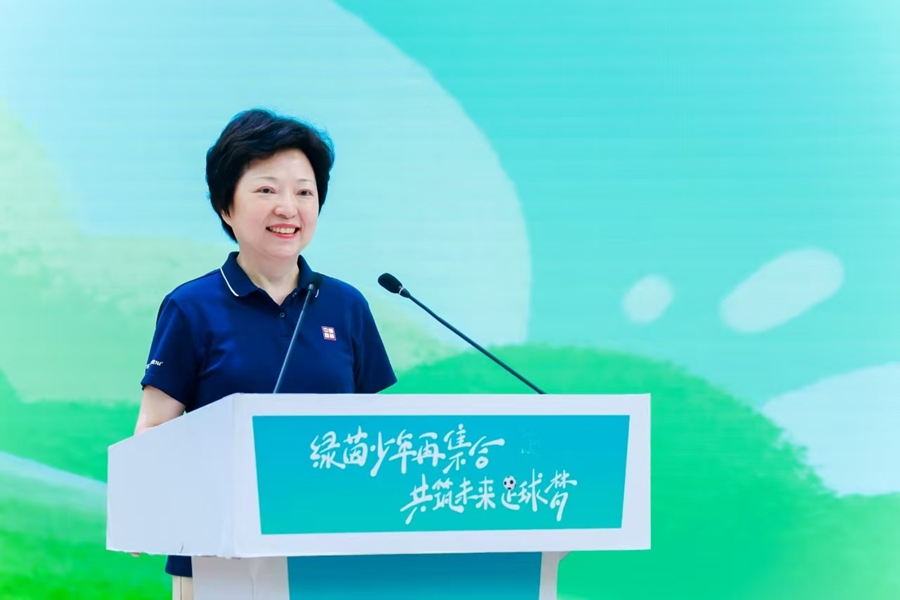 China Soong Ching Ling Foundation Vice Chairperson Shen Beili opens the "Future Classroom — Young Football Players Reunited, Building Future Football Dreams" event in Zhangjiagang, Jiangsu province, July 16, 2025. [Photo courtesy of CSCLF]