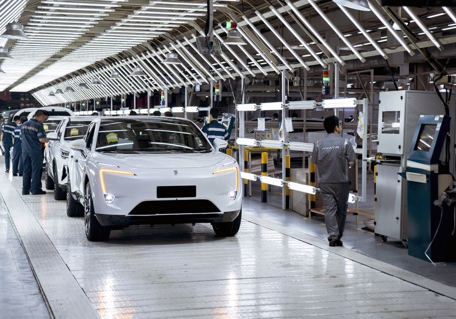 Workers are busy at a production line of the new energy vehicle AVATR at a workshop of Chang'an Auto in Jiangbei district, southwest China's Chongqing Municipality, July 20, 2023. [Photo/Xinhua]