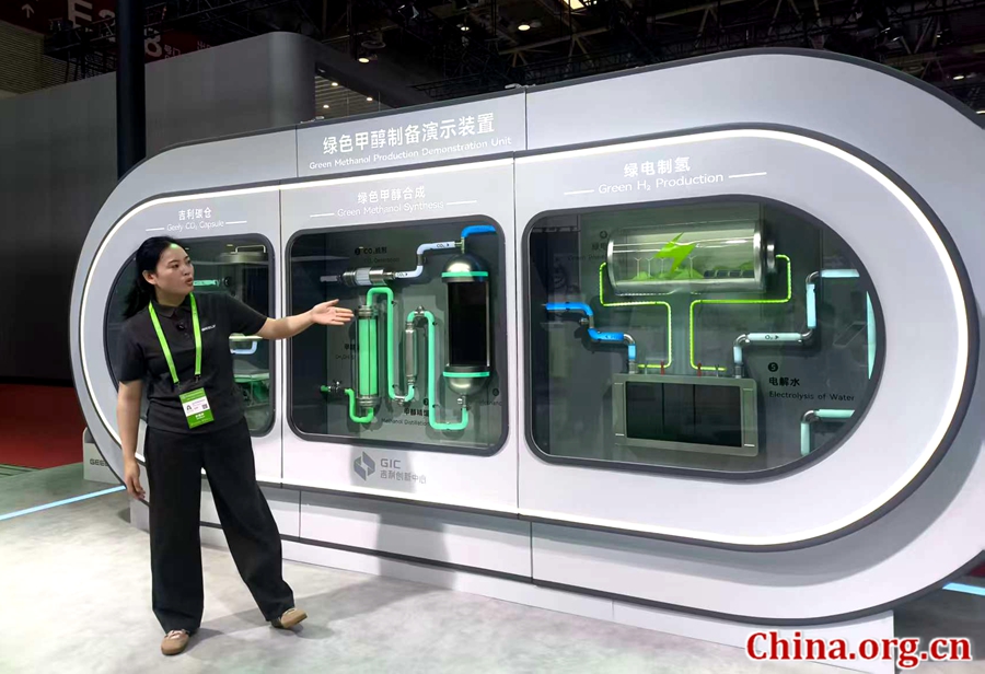 A staff member presents Geely's green methanol production demonstration unit at the third China International Supply Chain Expo (CISCE) held in Beijing, July 16, 2025. [Photo by Xu Xiaoxuan/China.org.cn]