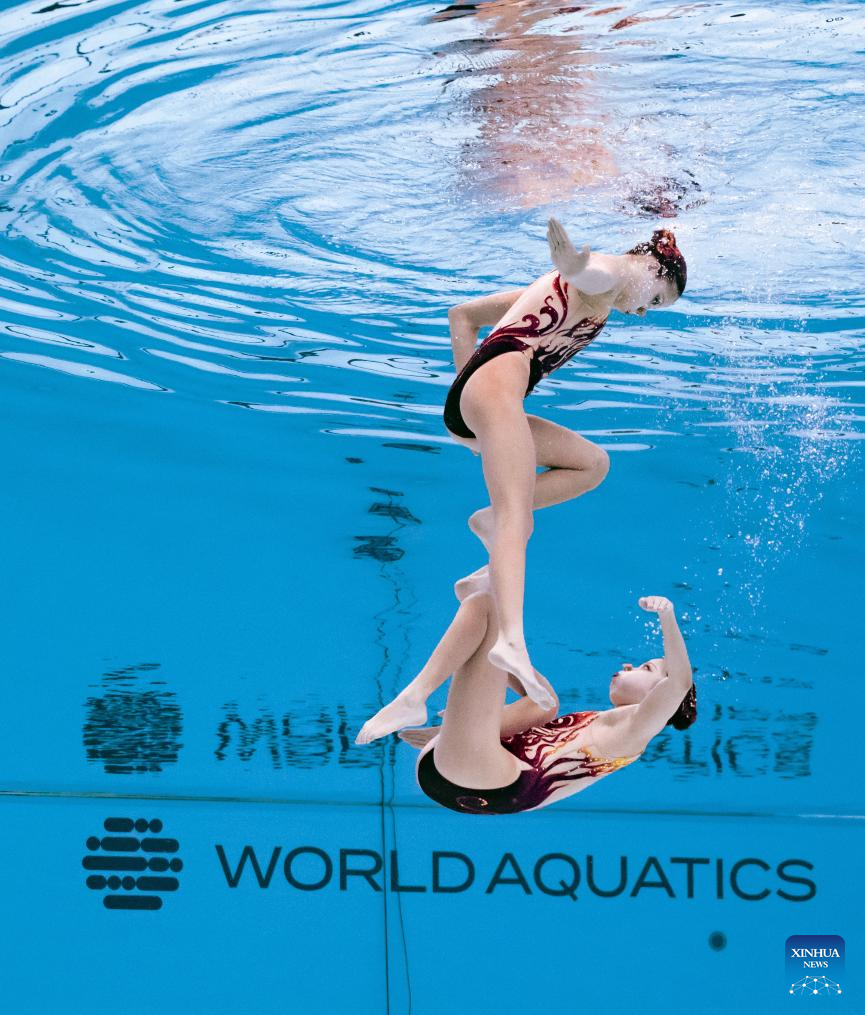 Lin Yanhan/Lin Yanjun of China perform during the women's duet technical final of artistic swimming at the World Aquatic Championships in Singapore, July 21, 2025. (Xinhua/Xia Yifang)