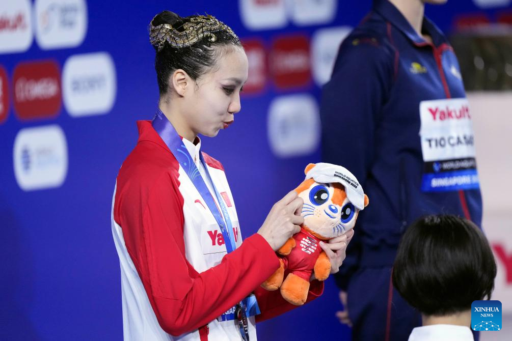 Xu Huiyan of China reacts during awarding ceremony for the women's solo free of artistic swimming at the World Aquatics Championships in Singapore, July 22, 2025. (Xinhua/Luo Yuan)