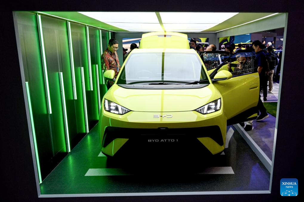 People visit the booth of Chinese auto brand BYD during the exclusive media day of GAIKINDO Indonesia International Auto Show (GIIAS) 2025 at the Indonesia Convention Exhibition in Tangerang, Banten Province, Indonesia, July 23, 2025. [Photo/Xinhua]