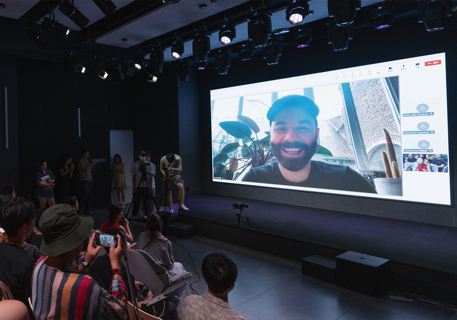 Reporters and influencers interact with French musician Woodkid via video link at a launch event for the "Death Stranding 2: On the Beach" soundtrack in Beijing, July 21, 2025. [Photo courtesy of Sony Music Entertainment China]