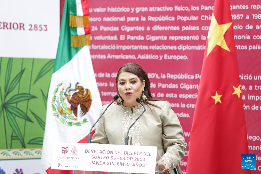 Mexico City Mayor Clara Brugada speaks at the launch ceremony of a national lottery commemorative ticket for the 35th birthday of the giant panda Xin Xin at Chapultepec Zoo in Mexico City, Mexico, on July 23, 2025. The Mexican government held a ceremony Wednesday in Mexico City, the capital of Mexico, to announce the issue of a national lottery commemorative ticket for the 35th birthday of the giant panda Xin Xin. (Photo by Francisco Canedo/Xinhua)
