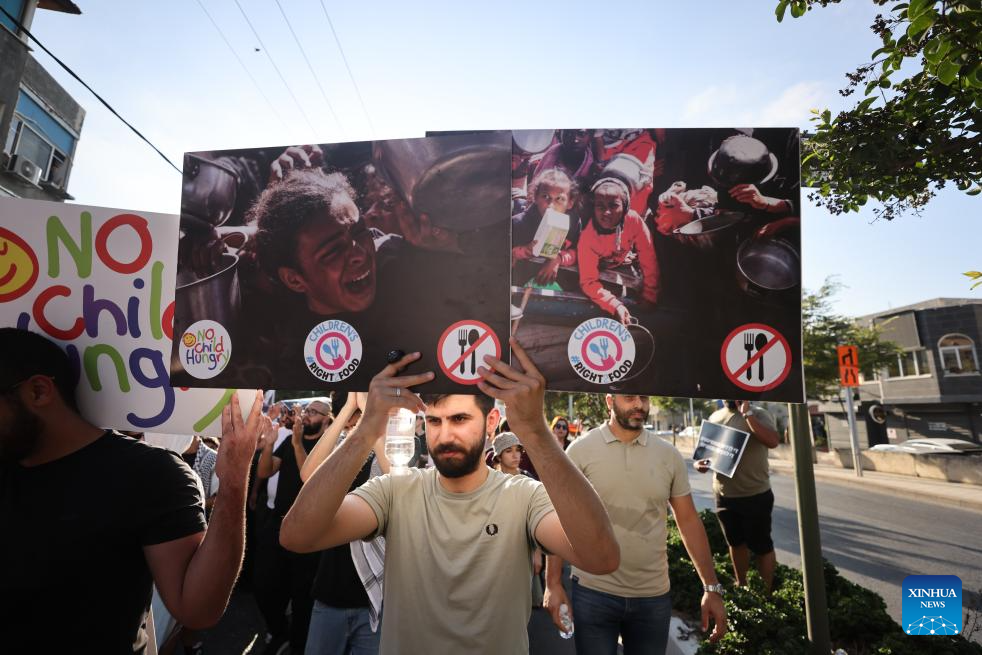 People protest to call for the lifting of all restrictions on humanitarian aid to the Gaza Strip in Sakhnin, northern Israel, July 25, 2025. [Photo by Jamal Awad/Xinhua]