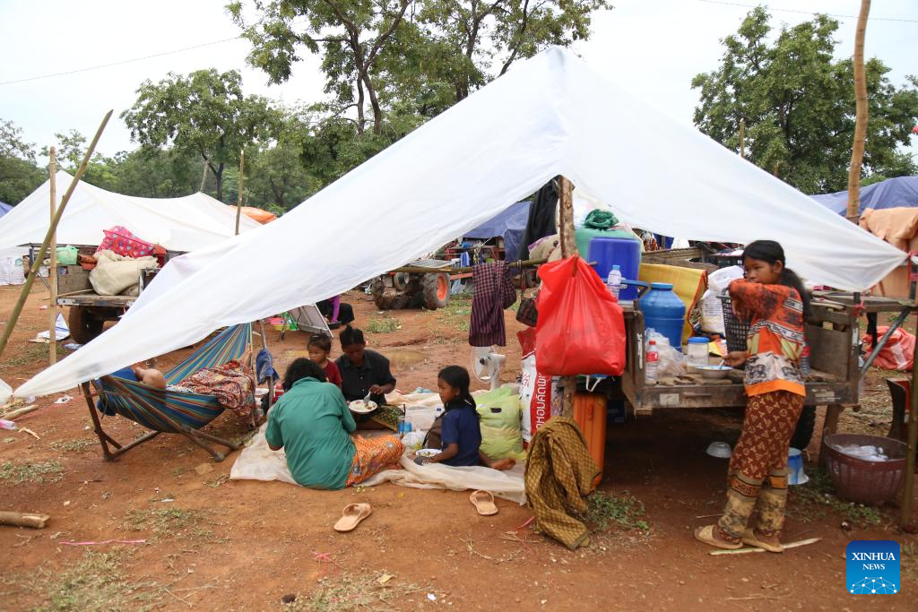 Cambodian evacuees from Cambodia-Thai border conflict gather at a refuge in Oddar Meanchey province, Cambodia, July 26, 2025. [Photo/Xinhua]