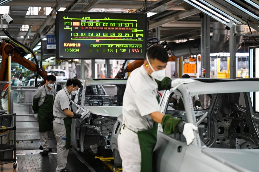 Staff members check products in process inside a welding workshop at the north China base of FAW-Volkswagen in north China's Tianjin, July 7, 2025. [Photo/Xinhua]
