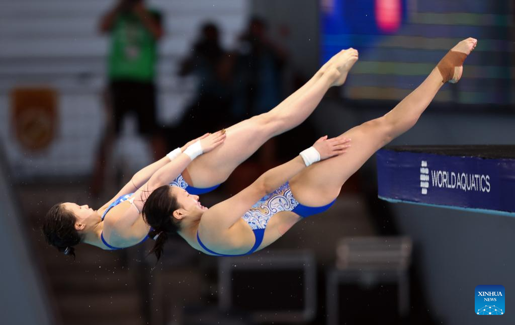 Chen Yuxi/Zhang Minjie of China compete during the women's 10m synchronised final of diving at the World Aquatics Championships in Singapore, July 28, 2025. [Photo/Xinhua]