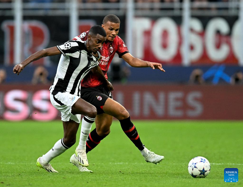 AC Milan's Malick Thiaw (R) vies with Newcastle United's Alexander Isak during their UEFA Champions League Group F match in Milan, Italy, on Sept. 19, 2023. (Str/Xinhua)
