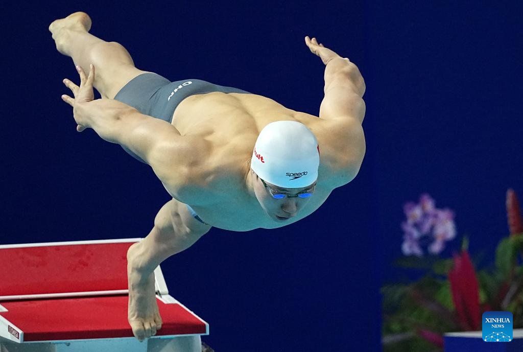Qin Haiyang of China competes during the men's 50m breaststroke semifinal of swimming at the World Aquatics Championships in Singapore, July 29, 2025. (Xinhua/Xue Yuge)
