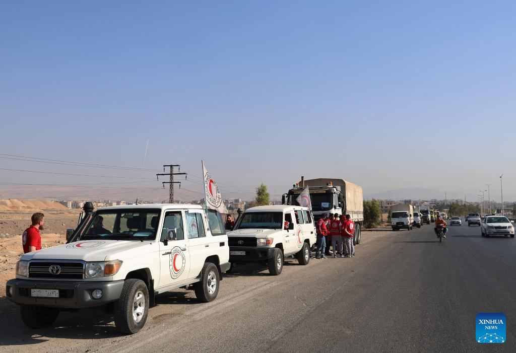 A humanitarian aid convoy is seen reaching the southern Syrian province of Sweida on July 29, 2025. [Photo/Xinhua]