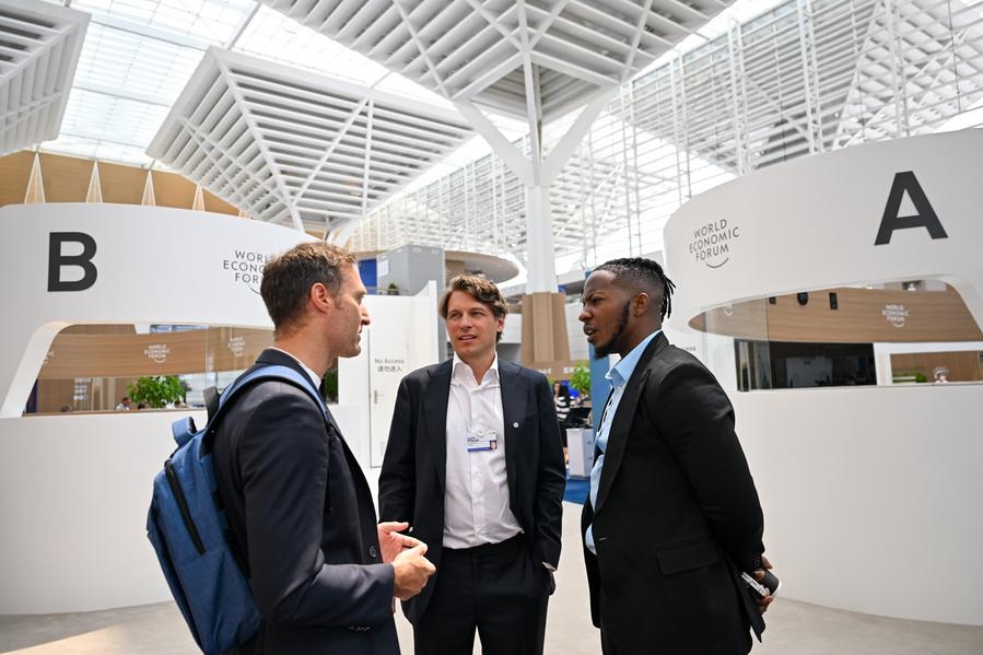Guests communicate with each other during the 2025 Summer Davos Forum at the National Convention and Exhibition Center (Tianjin) in north China's Tianjin Municipality, June 24, 2025. [Photo/Xinhua]