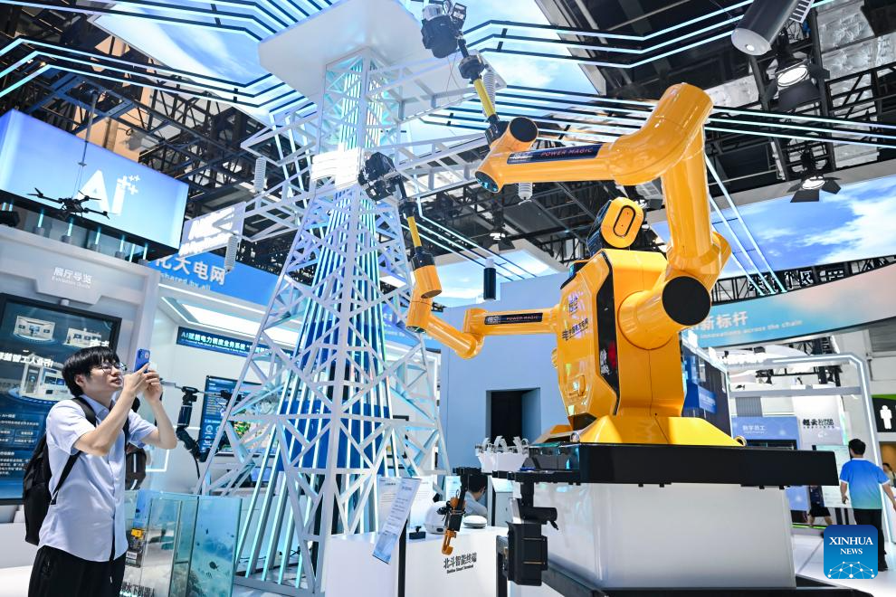 A visitor views a robot for live-line maintenance at the 2025 World AI Conference in east China's Shanghai, July 28, 2025. The ongoing 2025 World AI Conference showcases diverse application scenarios of AI. (Xinhua/Chen Haoming)