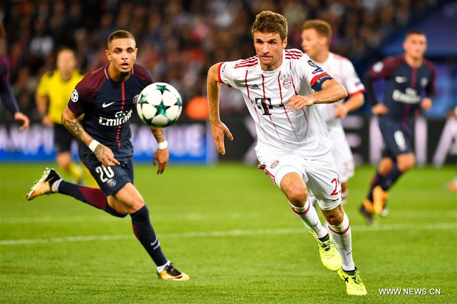 Layvin Kurzawa (L) from Paris Saint-Germain competes with Thomas Muller from Bayern Munich during their match of Group B of the 2017-18 season Champions League at Parc des Princes in Paris, France on Sept. 27, 2017. Paris Saint-Germain won by 3-0 at home. (Xinhua/Chen Yichen)
