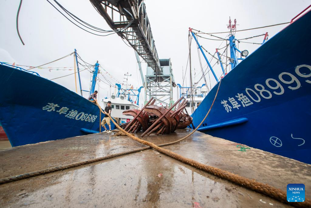The crew member inspect and reinforce mooring ropes at Huangshagang port in Sheyang County of Yancheng, east China's Jiangsu province, July 30, 2025. Co-May, the eighth typhoon of this year, made landfall for the second time in east China's Shanghai Municipality on Wednesday afternoon after it made landfall in Zhejiang province in early Wednesday morning, according to the Shanghai central meteorological observatory. Zhejiang and Jiangsu provinces have taken actions to step up hazard inspection and disaster prevention efforts while evacuating residents from dangerous places. (Photo by Peng Ling/Xinhua)