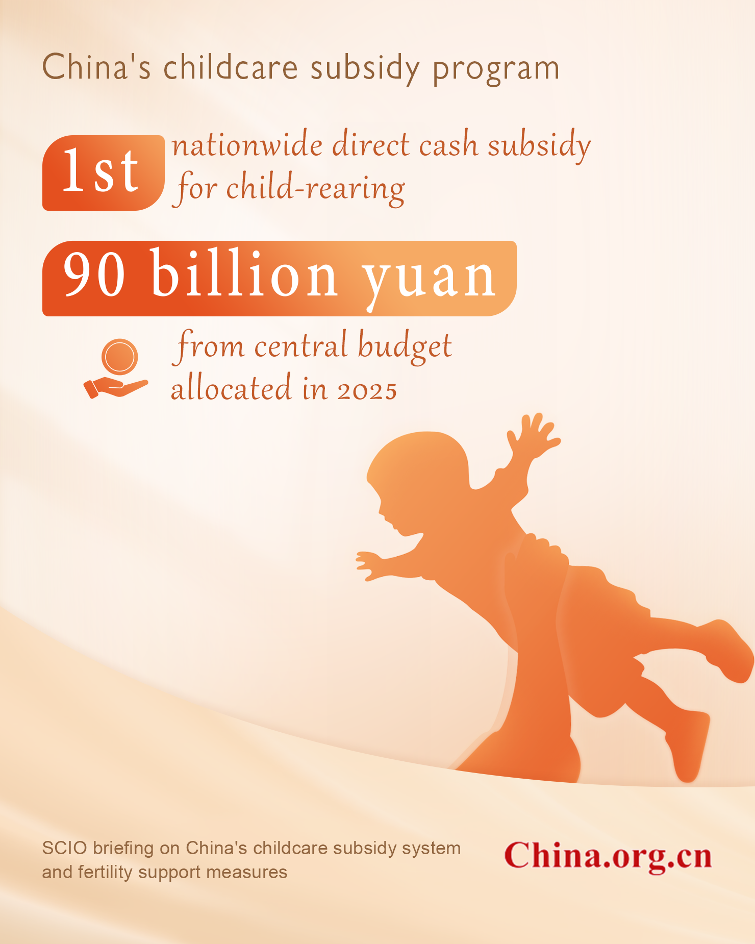 China has rolled out its first nationwide cash subsidy program for families with children under three since the founding of the People's Republic, with an initial central budget of 90 billion yuan (US$12.6 billion) this year to ease parenting costs and promote childbirth.