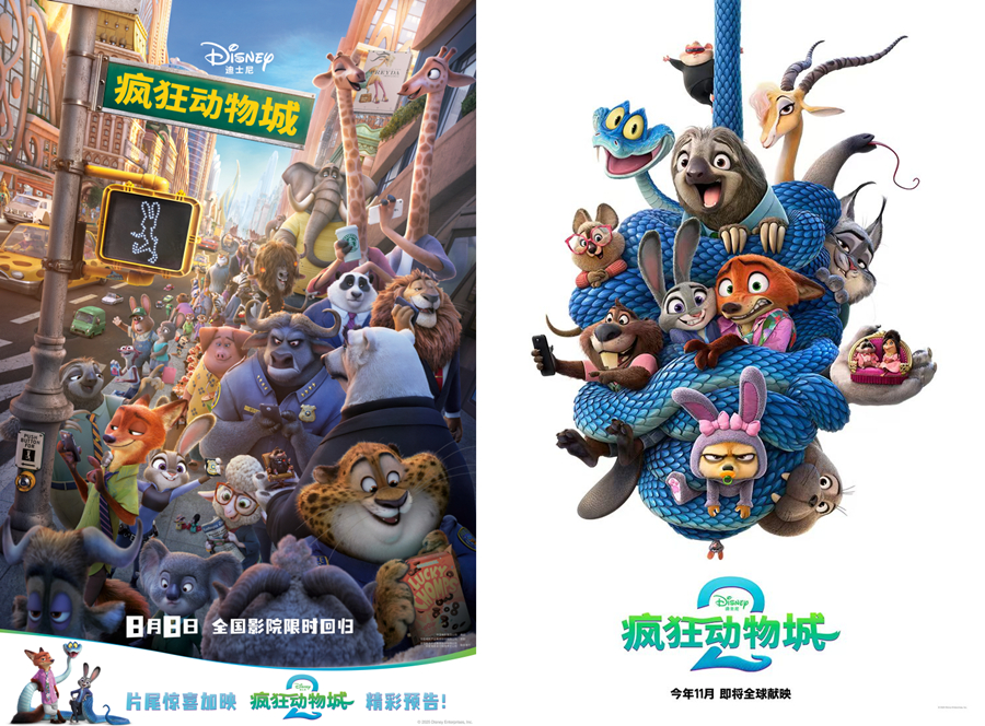Posters for the "Zootopia" China re-release and "Zootopia 2." [Photo courtesy of Walt Disney Animation Studios]