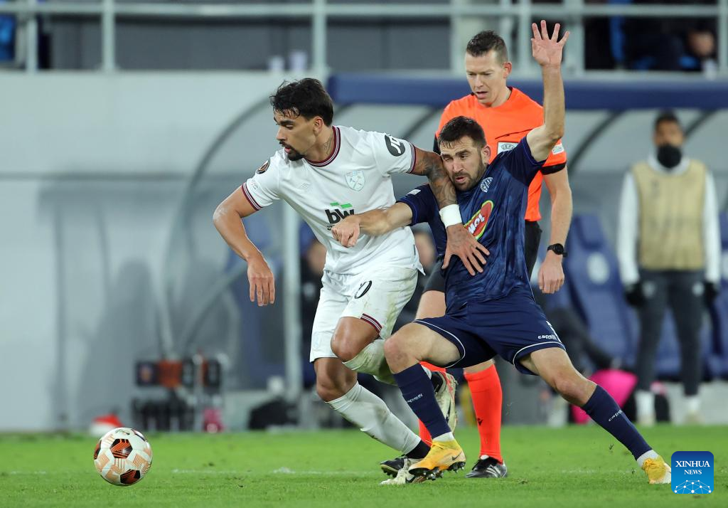 West Ham's Lucas Paqueta (L) vies with TSC's Milan Radin during UEFA Europa League group A match between TSC Backa Topola and West Ham in Backa Topola, Serbia on Nov. 30, 2023. (Photo by Predrag Milosavljevic/Xinhua)