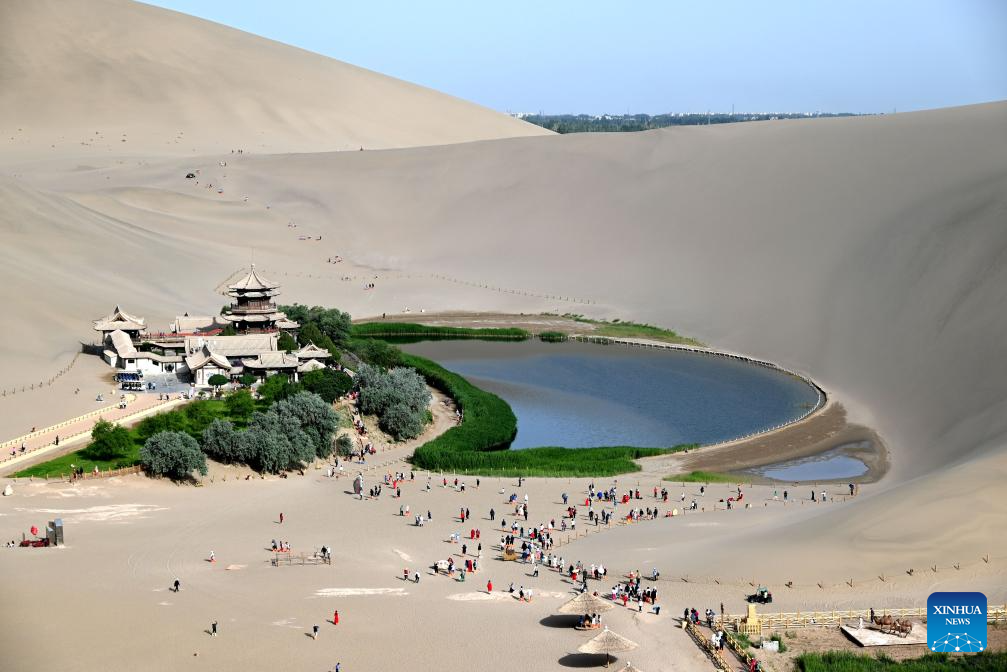 Tourists visit the Mingsha Mountain and Crescent Spring scenic spot in Dunhuang City, northwest China's Gansu Province, May 31, 2025. [Photo/Xinhua]