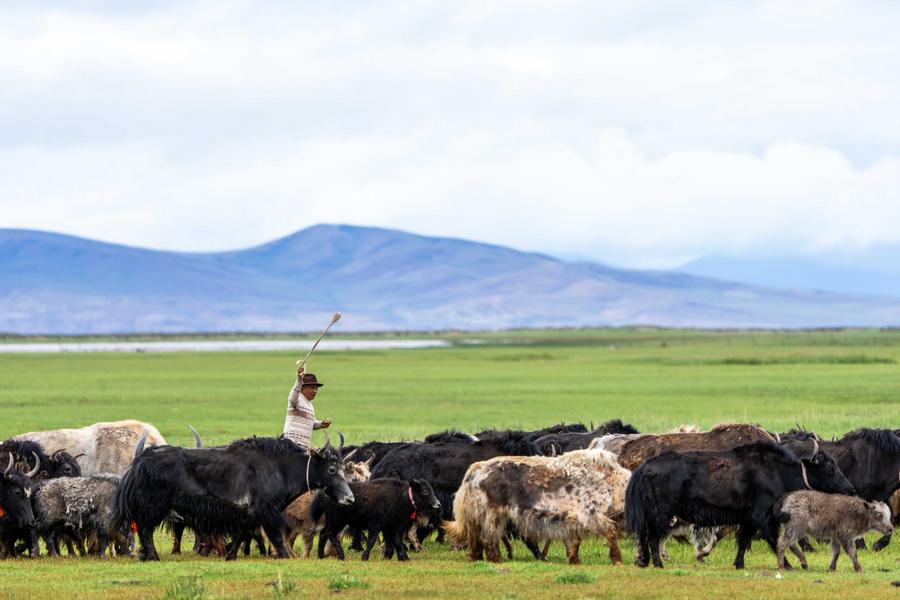 This photo taken on July 22, 2025 shows a herd of yaks in a wetland near Mapam Yumco Lake in Burang County of Ngari Prefecture, southwest China's Xizang Autonomous Region. [Photo/Xinhua]