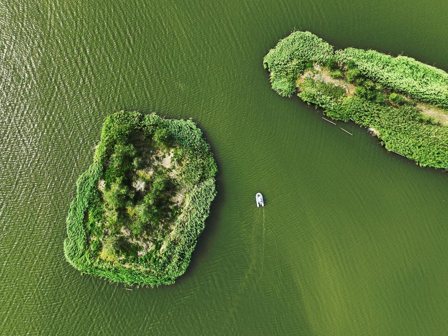 An aerial drone photo taken on June 5, 2025 shows volunteers taking a boat to inspect the breeding habitat of migrant birds at a wetland on the estuary of the Baisha River in Qingdao City, east China's Shandong Province. [Photo/Xinhua]