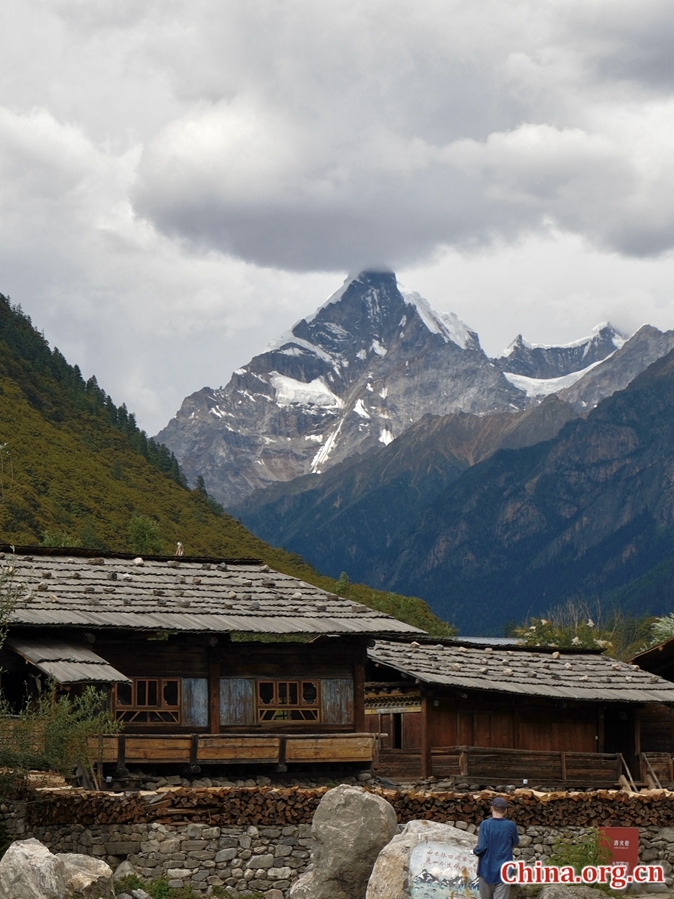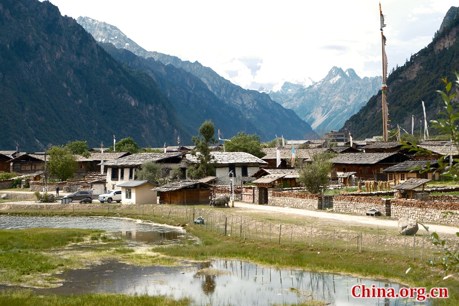 Traditional houses with snow-capped mountains in the background, Tsogo village, Gongbo Gyamda county, Nyingchi, Xizang Autonomous Region, July 26, 2025. [Photo by Liao Jiaxin/China.org.cn]