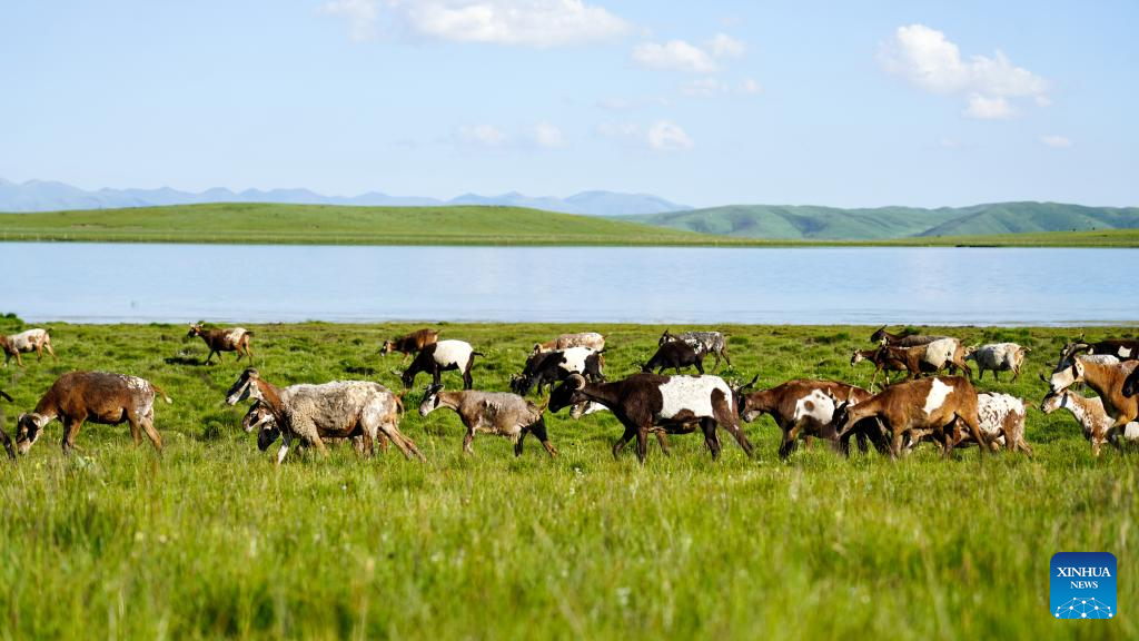 Sheep graze on a grassland in Zeku County, Huangnan Tibetan Autonomous Prefecture, northwest China's Qinghai Province, July 30, 2025. (Xinhua/Wang Yan)