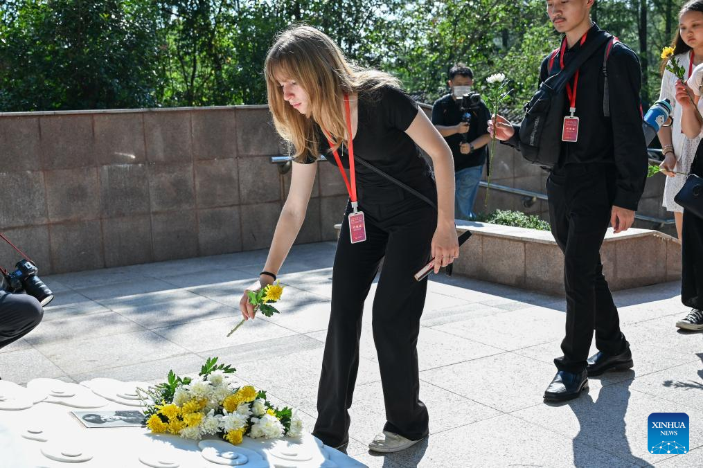 While visiting Hong'an, the student delegation laid chrysanthemums at the memorial site. Some were moved to tears while watching "Touching the Tigers," a documentary about Beneda's story.