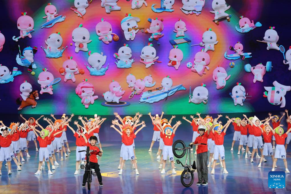 Photo taken on Aug. 2, 2025 shows the performance at the 100-day countdown launch ceremony for China's 15th National Games and 12th National Paralympic Games, along with the 9th National Special Olympics Games in Shenzhen, south China's Guangdong Province. (Xinhua/Liang Xu)