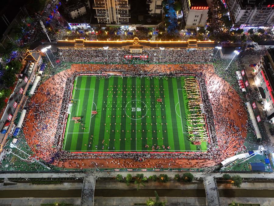 An aerial drone photo taken on July 26, 2025 shows the restart ceremony of the "Village Super League," also known as Cun Chao, staged in Rongjiang County, Guizhou Province in southwest China. [Photo/Xinhua]