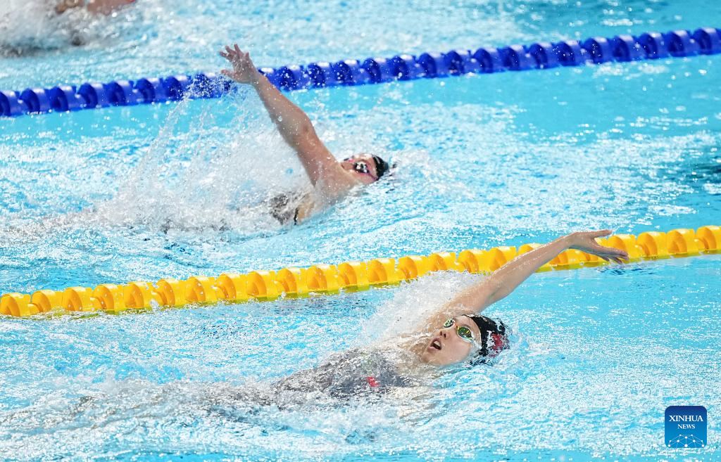 Peng Xuwei (bottom) of China competes during the women's 200m backstoke final of swimming at the World Aquatics Championships in Singapore, Aug. 2, 2025. (Xinhua/Xia Yifang)