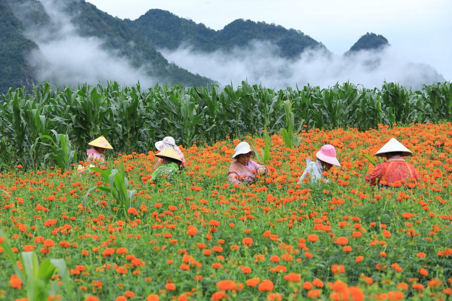 Farmers harvest marigold flowers in Tengchong, southwest China's Yunnan Province, July 21, 2025. [Photo/Xinhua]