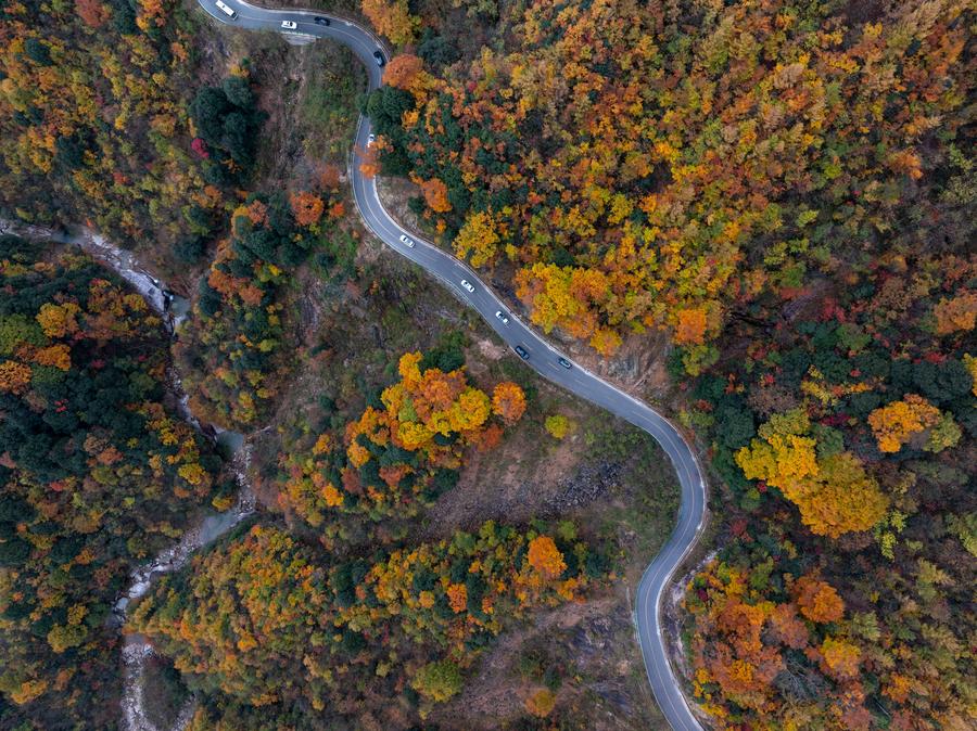 An aerial drone photo taken on Nov. 6, 2024 shows the scenery in Guangwu Mountain scenic area in Bazhong City, southwest China's Sichuan Province. [Photo/Xinhua]