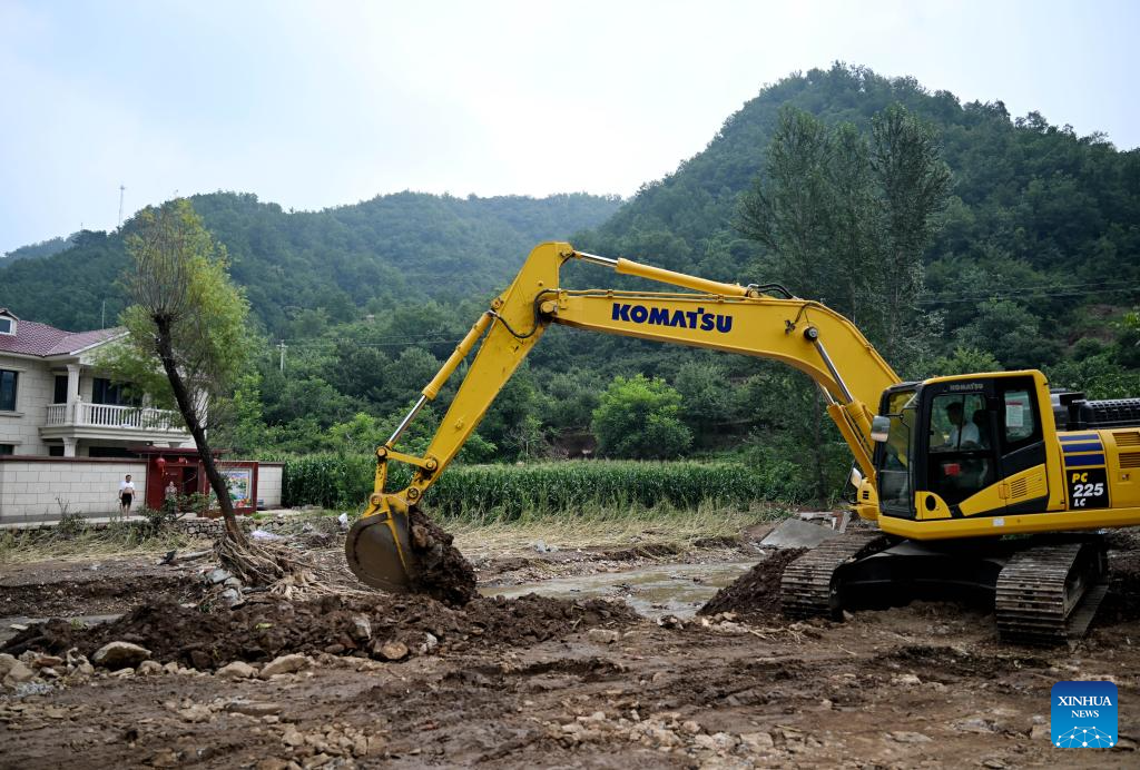 A staff member operates a digger to repair a damaged road in Nantai Village in Liudaohe Town, Xinglong County of north China's Hebei Province, Aug. 2, 2025. Affected by heavy rainfall, some roads and houses were damaged in several villages in Liudaohe Town. In recent days, local authorities have organized efforts to carry out relief operations to restore roads, power supply and communication facilities, along with environmental disinfection measures. (Xinhua/Wang Xiao)