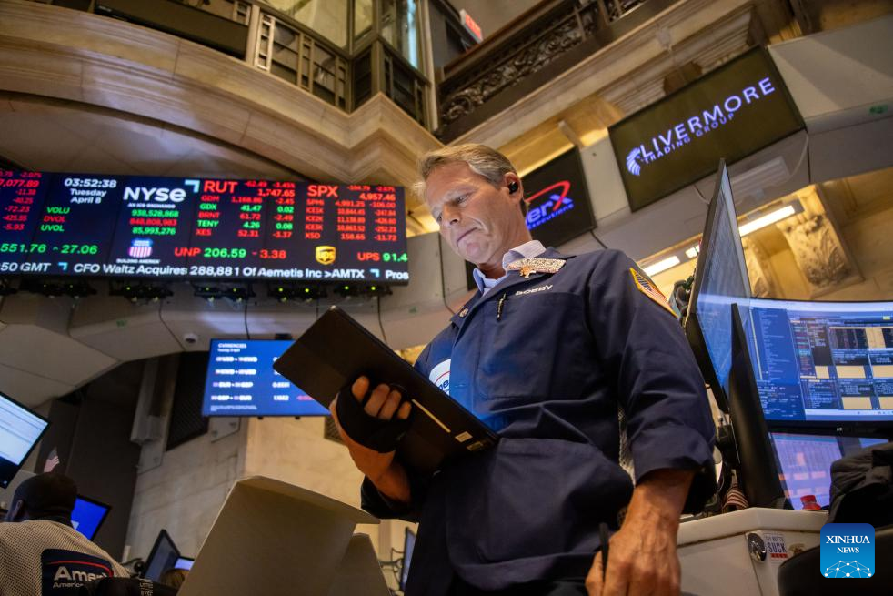 A trader works on the floor of the New York Stock Exchange in New York, the United States, on April 8, 2025. [Photo/Xinhua]