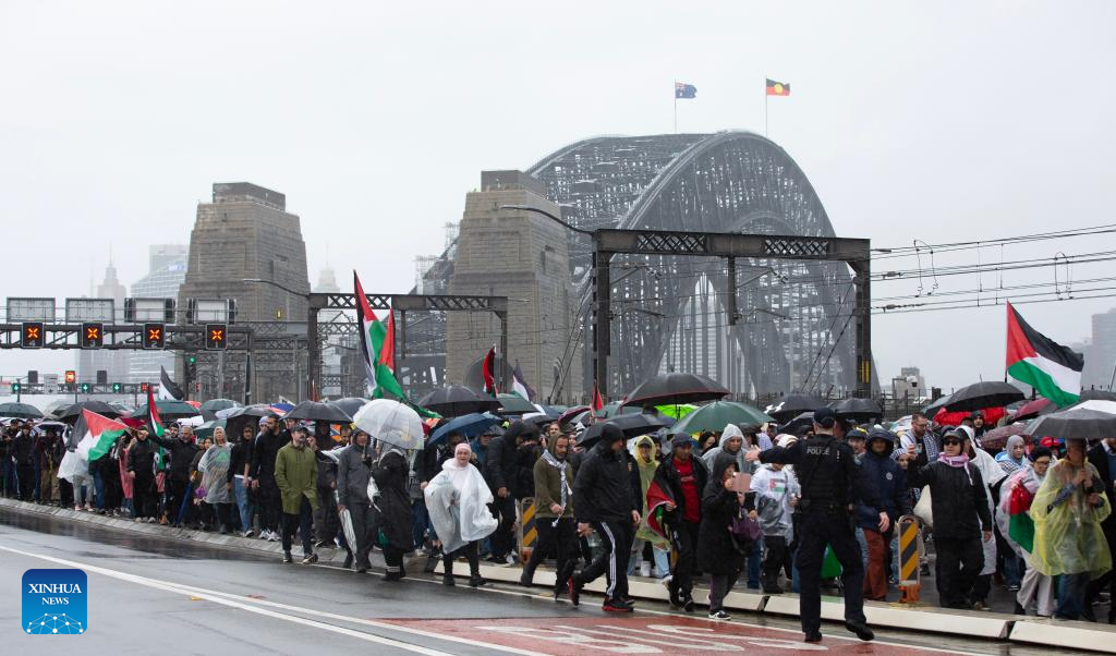 People march across Harbor Bridge to protest the ongoing war and famine in Gaza, in Sydney, Australia, Aug. 3, 2025. [Photo/Xinhua]
