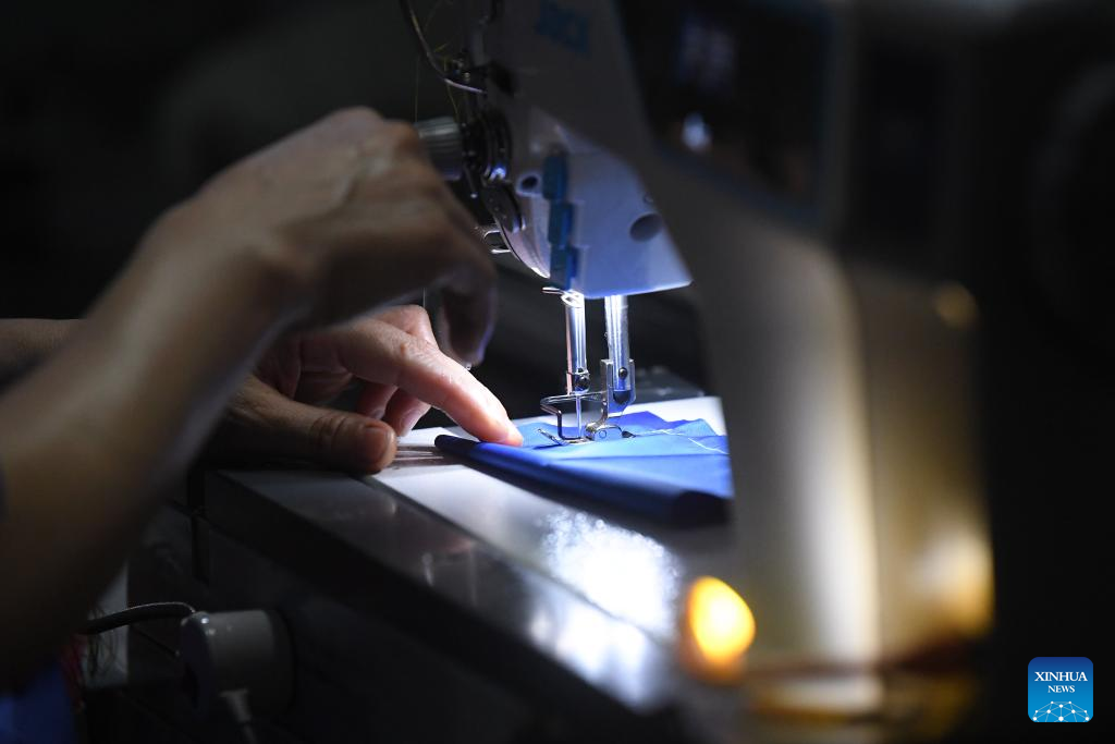 A staff member tests the performance of an intelligent sewing machine at a factory of Jack Technology Co., Ltd. in Taizhou Bay, Taizhou City, east China's Zhejiang Province, July 17, 2025. (Xinhua/Weng Xinyang)