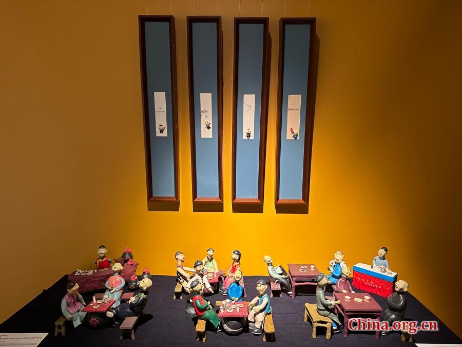 "The Impression of Old Beijing," a clay miniature series by Zhao Chunxiang based on the illustrated book "Roles in Beijing," in the "Edible Things" exhibition at China World Mall, Beijing, Aug. 1, 2025. Through sculpted scenes of disappearing trades, the series evokes a vanishing yet resilient urban soul. [Photo by Liu Ziying/China.org.cn]