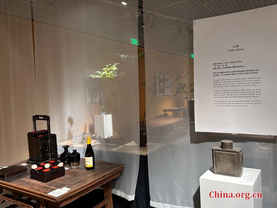 The Public Space section of the "Edible Things" exhibition at China World Mall, Beijing, Aug. 1, 2025. Benches, liquor tables, traveling cases and communal utensils reflect the mobility and sociability of ancient civic life. [Photo by Liu Ziying/China.org.cn]