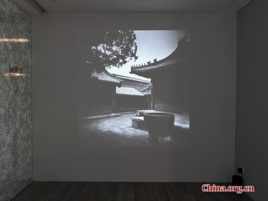 A screening room tucked into a gallery corner continuously plays footage of the curatorial development and Michael Kenna's participation at the "Light Etchings" exhibition at KWM Art Center in Beijing, July 30, 2025. [Photo by Liu Ziying/China.org.cn]