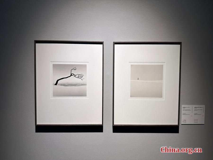 Two trees photographed in Japan by Michael Kenna are displayed at the "Light Etchings" exhibition at KWM Art Center in Beijing, July 30, 2025. Set against vast blankness, the trees appear as mirrored silhouettes in an example of Kenna's contemplative compositional style. [Photo by Liu Ziying/China.org.cn]