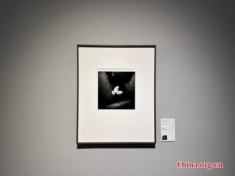 A photograph of a white bird captured in France by Michael Kenna is displayed at the "Light Etchings" exhibition at KWM Art Center in Beijing, July 30, 2025. The bird appears suspended mid-frame, exemplifying Kenna's ability to capture moments between motion and stillness. [Photo by Liu Ziying/China.org.cn]